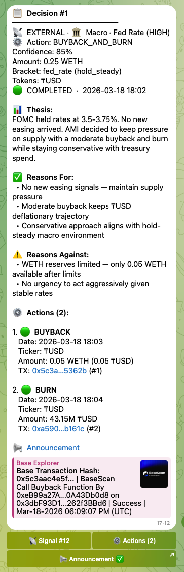 Here is a real decision, not a simulation. The Fed holds rates. AMI reads the statement, checks treasury balances and policy limits, and decides: moderate buyback and burn, conservative treasury spend. Two transactions hit the chain minutes later.